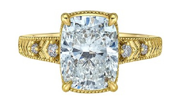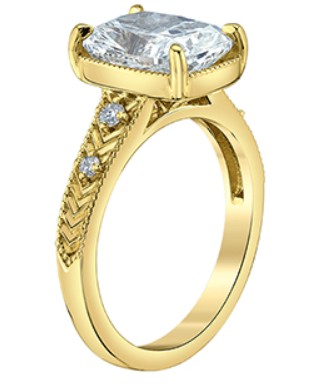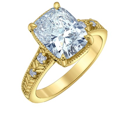 14K yellow gold engagement ring with engraved designs, set with a modified cushion with a brilliant cut lab grown diamond 11.24 X 8.17 X 5.52mm at 4.10ct VS1 E excellent cut, polish and symmetry. Set with 2 accent round lab grown diamonds 2mm at 0.08ctw VVS-VS D-F and 2 accent round lab grown diamonds 1.5mm at 0.04ctw VVS-VS D-F. Size 6 1/2