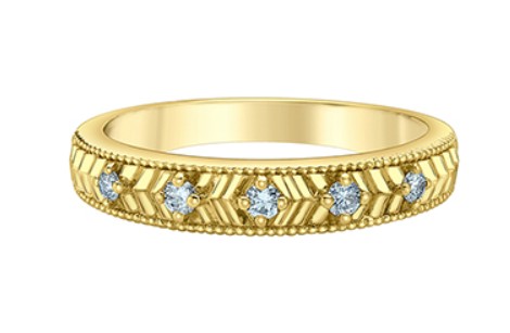 14K yellow gold wedding band set with 5 lab grown diamonds 0.13ctw, hand engraved detail and a millgrain edge. Size 7 1/4. Made with Canadian certified gold.