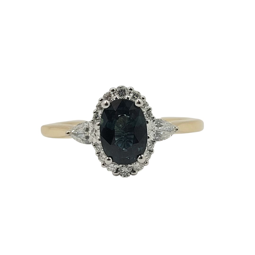 14K Yellow & White Gold Green Sapphire and Diamond Ring, set in White Gold with 7 x 5mm Oval Sapphire and 2 Pear Shaped Accent Diamonds at 0.18ctw and 14 Round Halo Diamonds at 0.12ctw, SI2 GH, Size 6 1/2