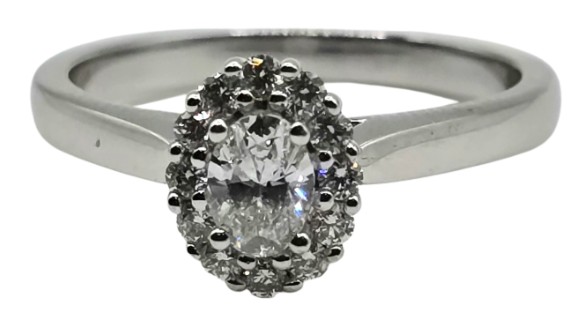 18K Palladium White gold oval halo engagement ring set with a 0.30ct SI GH oval center, 12 round diamonds set in halo at 0.18ctw SI GH and 2 peek a boo at 0.02ctw